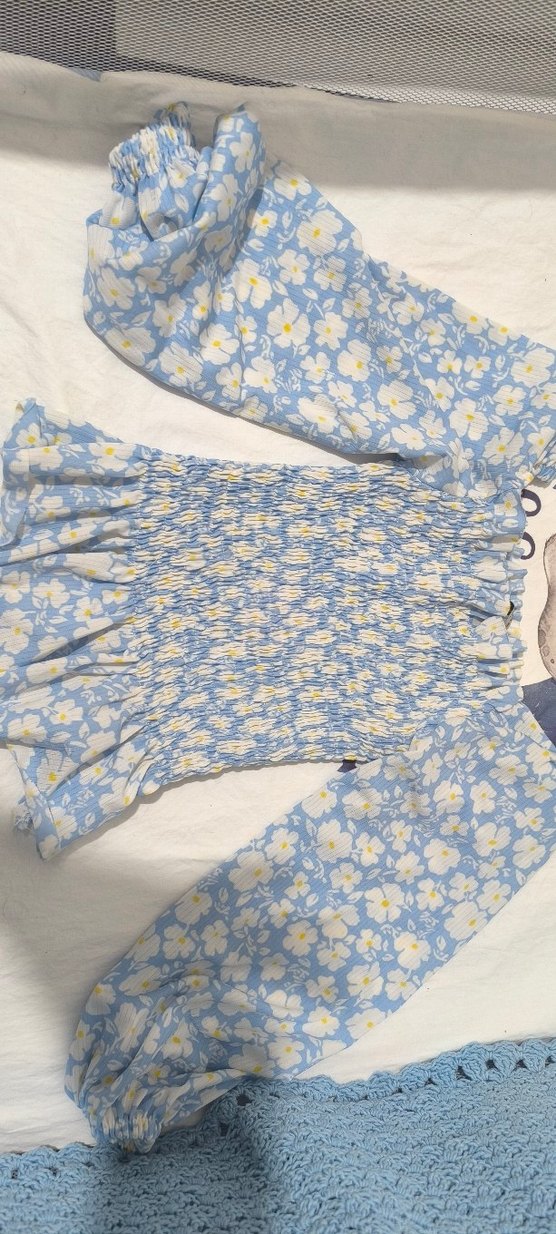 Mavi, uzun kollu, ruffles detaylı, tekne yakalı, pastel çiçek desenli, bohem tarzda dar kesim bluz. hiçbir sıkıntısı yoktur