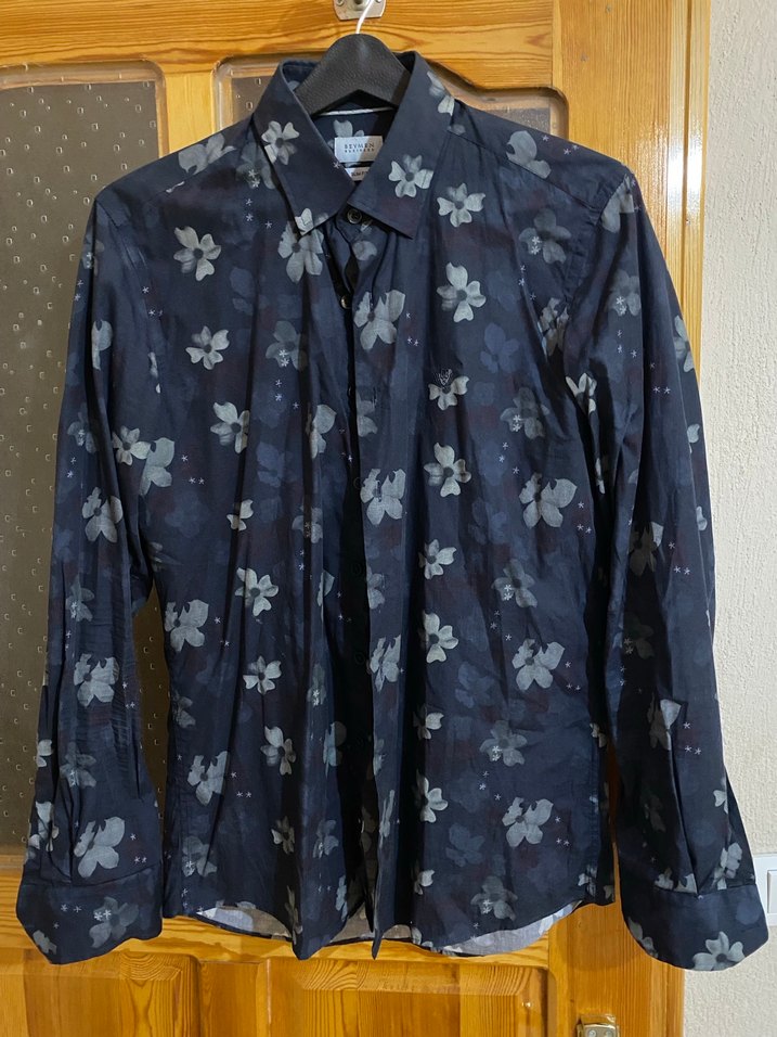Uzun kollu, çok şık ve tarz erkek gömleği. Koyu mavi tie-dye desenli, çiçek motifli, fit kesim. Pamuk, rahat kumaştan, ofis, gündelik ve özel kullanıma uygun.