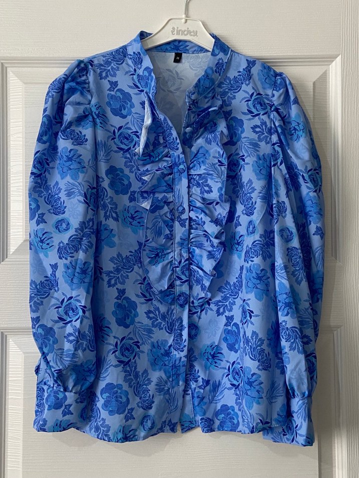 Mavi keten kumaştan, uzun kollu, yakalı ve düğmeli gömlek. Bohem tarzına uygun, gevşek kesim ve çiçek desenli.