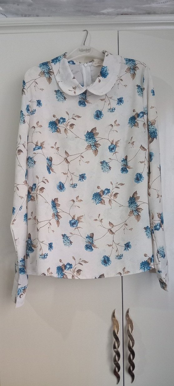 Yumuşak sentetik kumaştan, uzun kollu ve yüksek yakalı, pastel mavi çiçek desenli, bol kesim kadın gömleği. Düğmeli detaylar ve retro bohem tarzı.