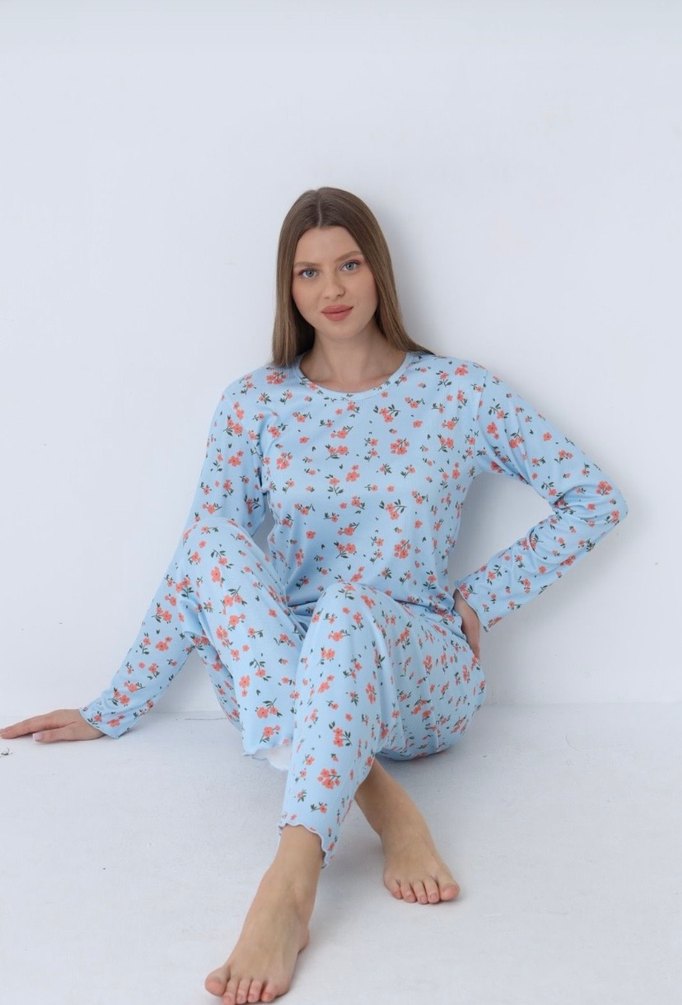 Mavi Çiçek Desenli Uzun Kollu Kadın Pijama Takımı - Görsel 1