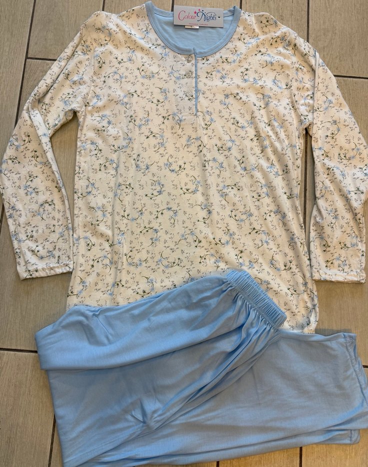 Uzun kollu ve bol kesim kadın pijama takımı, pastel mavi pantolon ve çiçek desenli üst ile rahat ve şık bir uyku deneyimi sunar. Bedenleri mevcuttur.