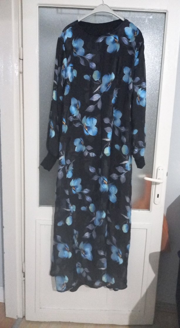 Sentetik kumaştan, uzun kollu, yüksek yakalı ve bol kesimli mavi çiçek desenli, drapeli uzun elbise. Minimalist gotik tarz için uygun. astarı şifon