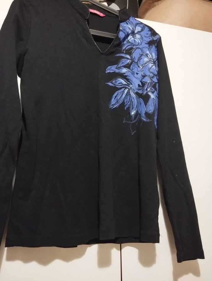 Kadınlar için uzun kollu, V yaka bluz. Koyu renkli, bir yanında mavi çiçek baskısı bulunan Günlük kullanıma uygun, zahmetsiz şıklık sunar.