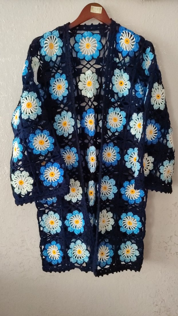 Mavi çiçek desenli, uzun ve bol kesim örgü hırka, yakası kesimli, bohem tarz için uygundur.