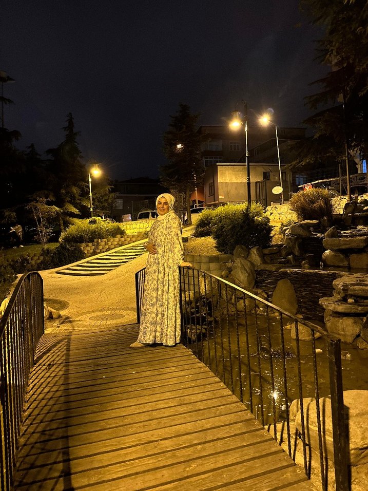 Mavi çiçek desenli uzun pamuklu elbise, düğmeli, yakalı ve askılı kolludur. Bol kesimiyle bohem tarzı yansıtır.