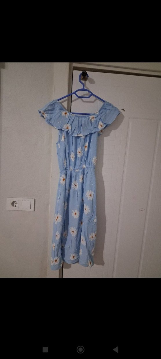 Mavi, askısız ve kolsuz, bol kesim elbise, volan detaylı ve pastel çiçek desenlidir, yumuşak sentetik kumaştan üretilmiştir.