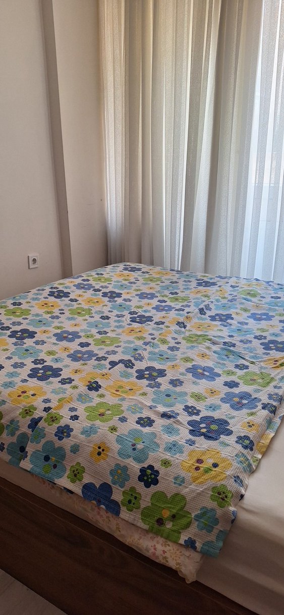 Pastel tonlarda mavi, yeşil ve sarı çiçek desenleriyle yatak odasına ferah bir görünüm katan yatak örtüsü pike