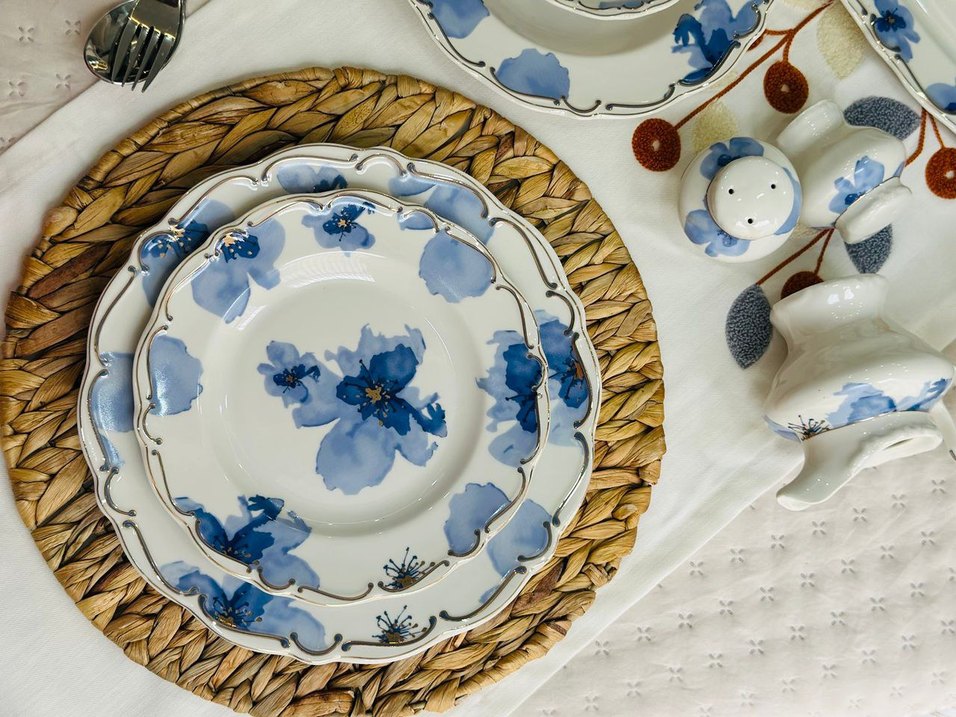 Hafif mavi çiçek desenli, zarif tasarımlı yemek tabakları seti. ️
