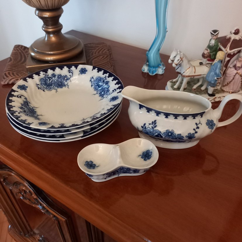Mavi çiçek desenli tabaklar, sosluk ve küçük bölmeli servis kabı içeren porselen yemek takımı. ️