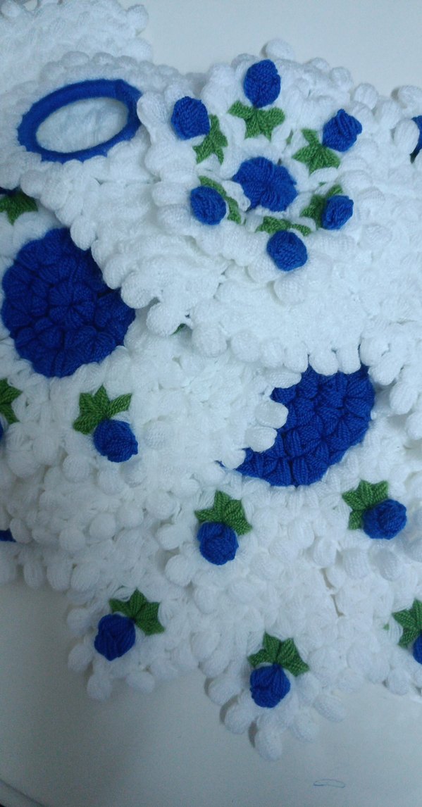 Mavi ve beyaz renklerde, küçük mavi çiçek ve yeşil yaprak detaylı örgü banyo süngerleri. Yumuşak ve renkli yapısı ile banyo keyfi sağlar.