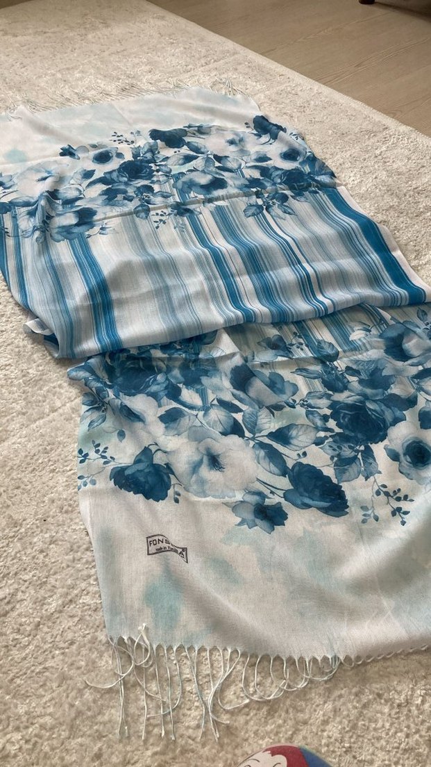 Kadın şalı, mavi çiçekli ve çizgili desenlerle yumuşak dokulu kumaştan, bohem tarzda drapeli şekilde tasarlanmıştır. Hiç kullanılmadı.