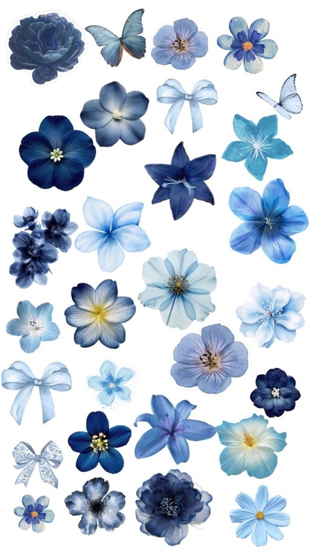 Farklı mavi tonlarında çiçek ve fiyonk desenleri içeren sticker