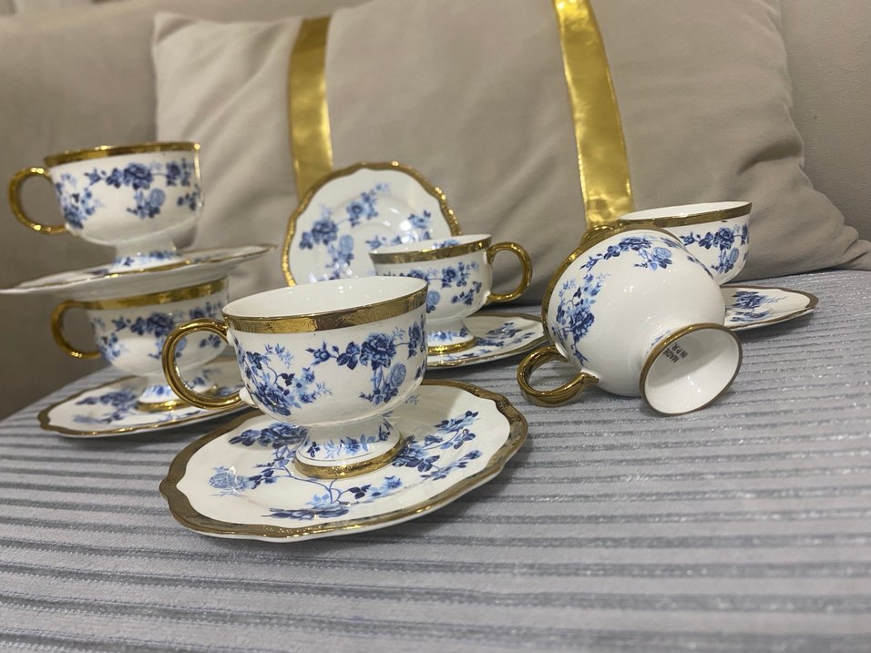 Bu porselen fincan takımı koyu mavi çiçek desenleri ve altın yaldız detaylarıyla şık ve klasik bir görünüm sunar. ☕