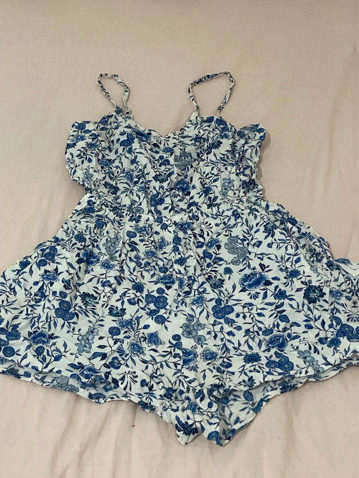 Kadın tulumu, bol kesim ve fırfır detaylıdır. Pastel mavi çiçek desenine sahip, ince askılı ve straplez yaka, pamuk kumaştan bohem tarzda üretilmiştir.