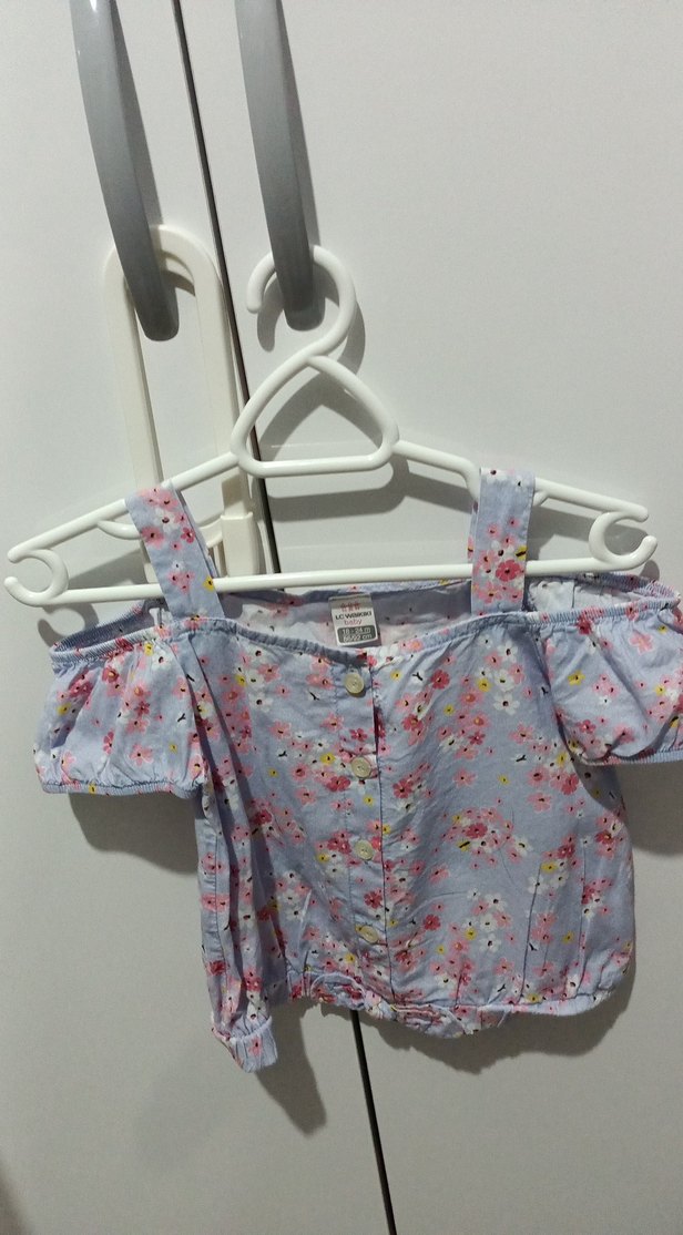Pamuklu, mavi, pastel çiçek desenli, askılı, straplez yaka, düğmeli ve bol kesim kız bluzu.