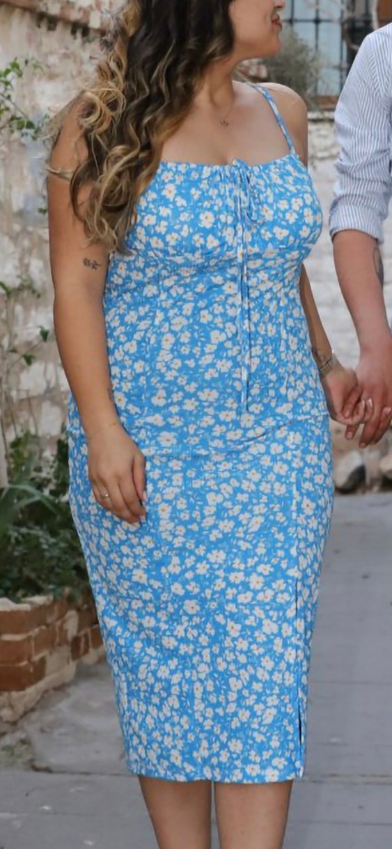 Askılı, straplez yaka , mavi pastel çiçek desenli, vücuda oturan midi elbise. Yumuşak sentetik kumaştan, bohem tarzda dış mekan kullanımı için uygundur. Esnek kumaş . Bir defa çekimde giyildi .