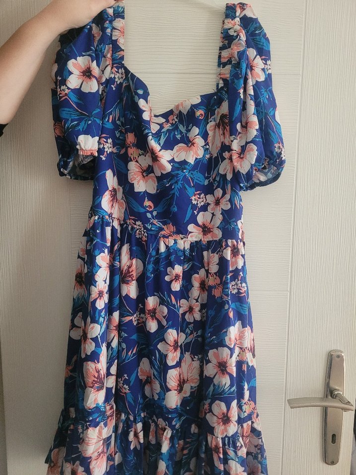 Mavi çiçek desenli, salaş kesim midi elbise. Askılı kollu ve straplez yaka, fırfır detaylarıyla bohem tarzı yansıtıyor.