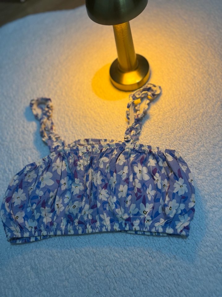 Bohem tarzda, mavi tonlarında beyaz çiçek desenli, fırfırlı askılı vintage mini crop