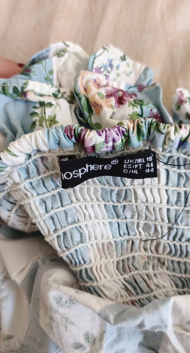 Mavi, pastel çiçek desenli, fırfırlı, askılı, bol kesim elbise.Yumuşak sentetik kumaştan, günlük kullanım için uygun.