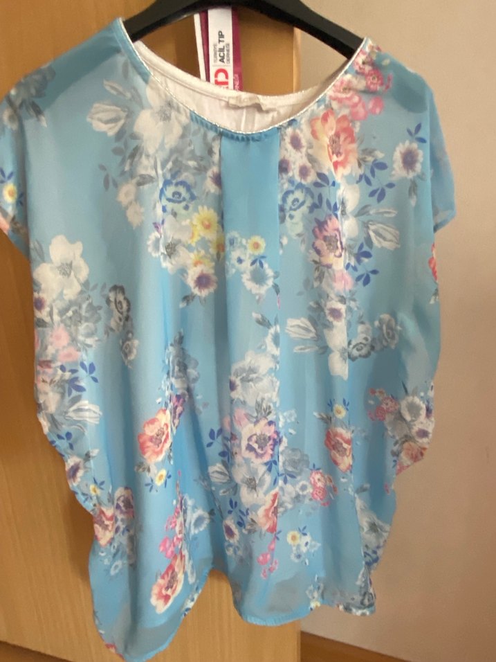 Mavi renkte, kısa kollu, yuvarlak yakalı, salaş kesim, drapeli ve pastel çiçek desenli kadın bluz.