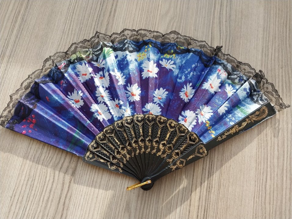 Siyah dantel ve altın detaylı sap kısmı ile koyu mavi çiçek desenli yelpaze.
