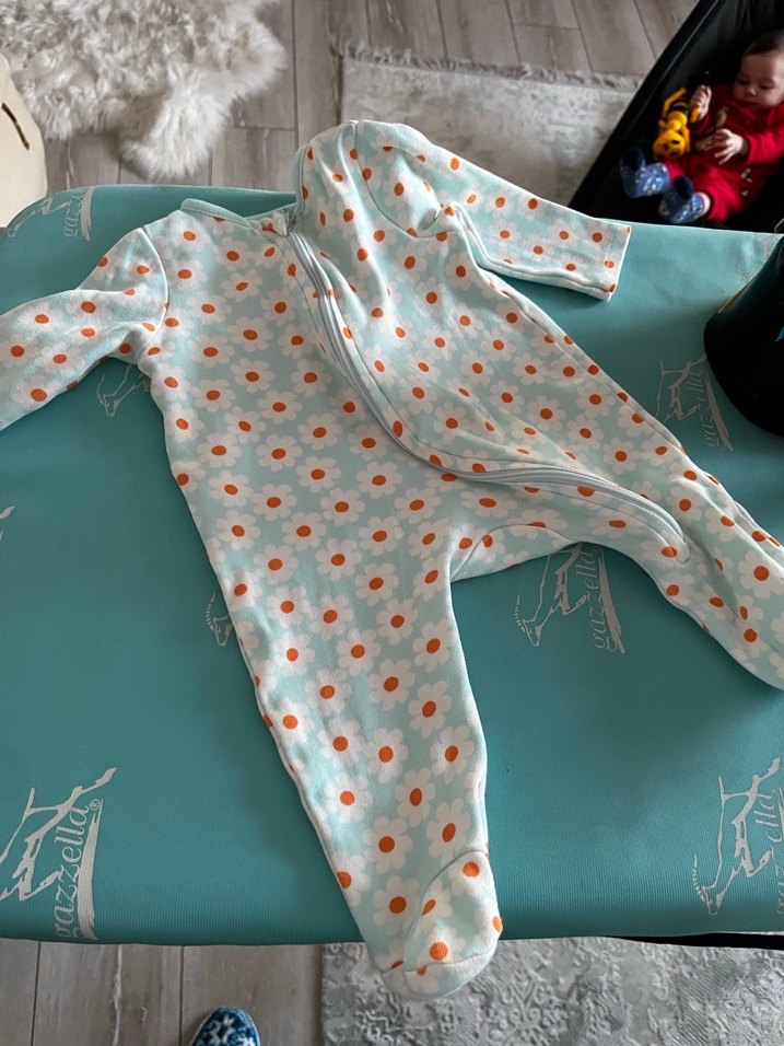 Pastel mavi renkte, çiçek desenli ve düğmeli bebek tulumu. Rahat ve konforlu, küçük kızlar için uygun.
