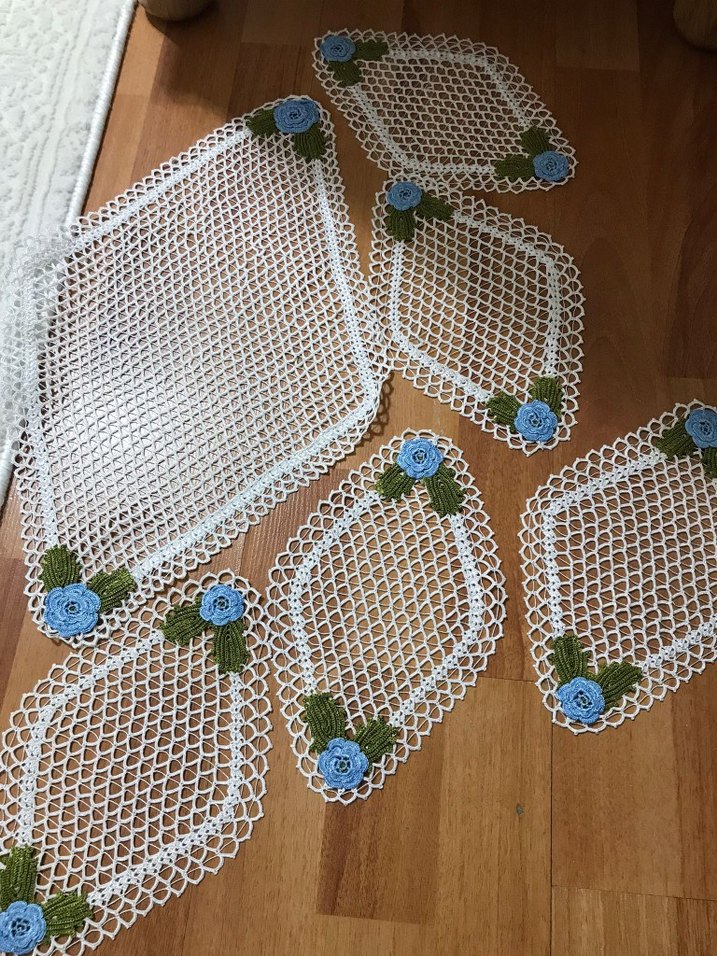 El örgüsü dantel takımı, mavi çiçek ve yeşil yaprak motifleriyle süslenmiş, geleneksel dekor için uygun. 5 tane peçete