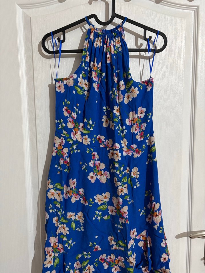 Mavi halter yakalı elbise. Hiçbir deformasyonu yoktur.