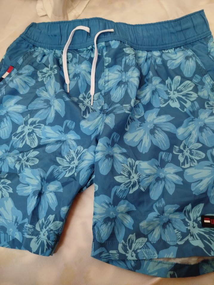 Mavi renkte, renkli çiçek desenli, bağcıklı, rahat kesim erkek şort.8.9 10 yaşa uygun