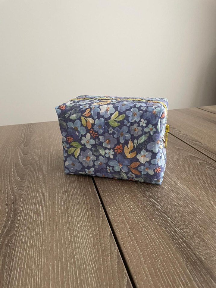 Mavi renkte, çiçek desenli ve fermuarlı poplin kumaştan yapılmış kadın makyaj çantası. Bohem ve retro tarzlara uygundur.