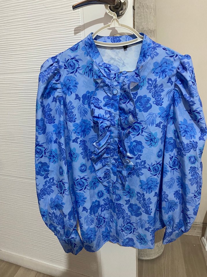 Sentetik kumaştan, fırfırlı detaylı, yakalı, uzun kollu, bol kesim, pastel mavi çiçekli gömlek.