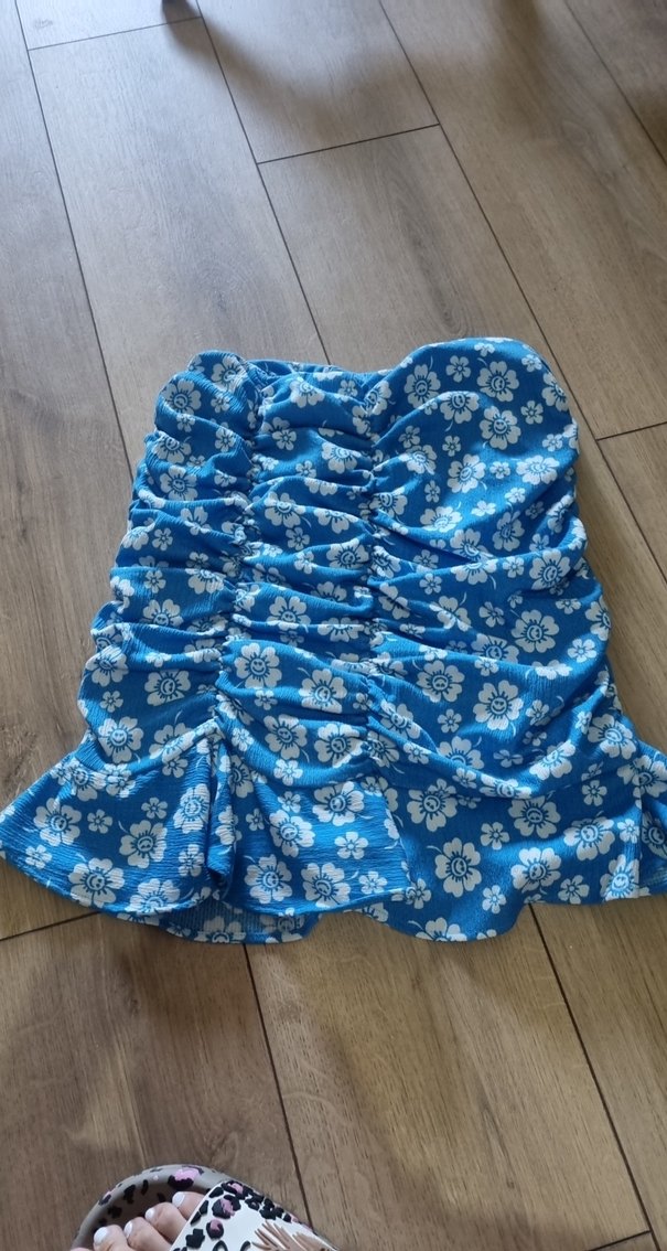 Mavi mini etek, çiçek desenli ve fırfır detaylı, bohem tarzda ve plaj için uygun.