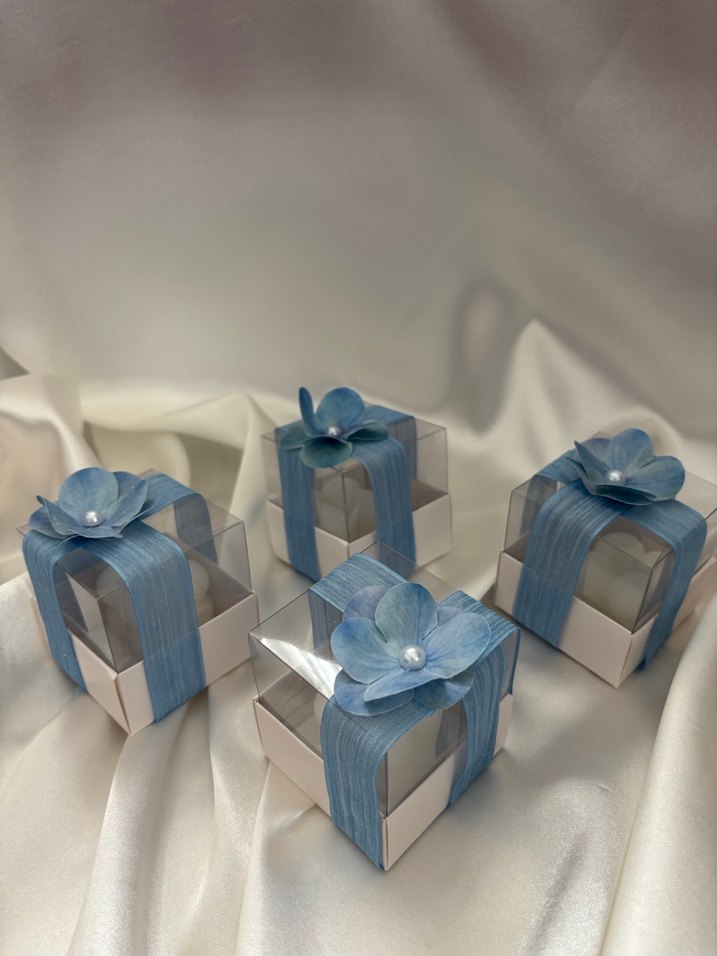 Mavi kurdele ve inci detaylı yapay çiçeklerle süslenmiş küçük hediye kutuları, özel anlar için uygun. İstediğiniz renk ve süslemeyi çalışabiliriz kutu içeriğinde Bubble mum bulunuyor