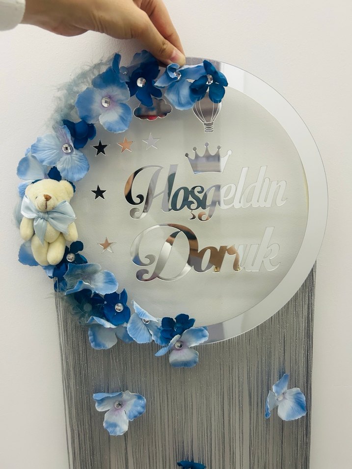Mavi çiçekler ve küçük bir oyuncak ayı ile yuvarlak hoşgeldin süsü. 'Hoşgeldin Doruk' yazısı ve gri ipler ile süslenmiştir. #kapısüsü #doruk #hoşgeldindoruk #hoşgeldin
