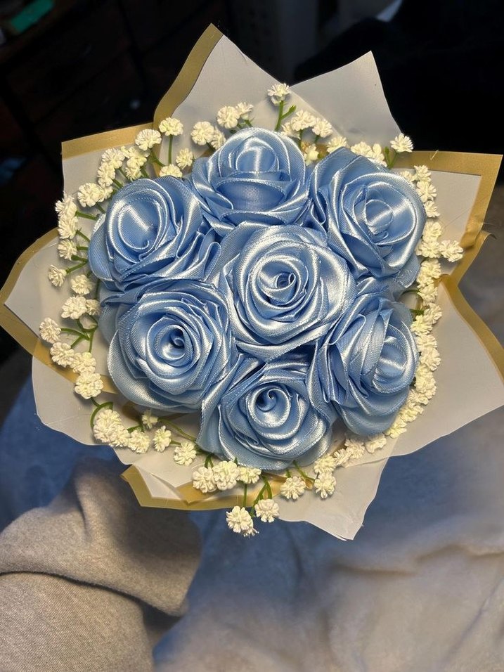 Kadın broşu, renkli mavi çiçek desenleri ve kurdele detayı ile klasik zarafet ve bohem Paris tarzını bir araya getiriyor.