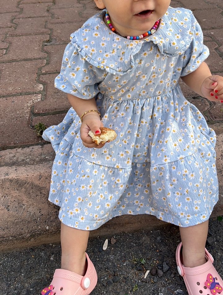 Pamuklu, pastel mavi renkli, bol kesim kız elbisesi. Kısa balon kollu, yakalı ve fırfırlı, çiçekli desenlidir.