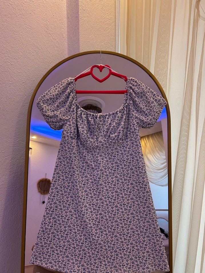 Mavi Çiçekli Kısa Kollu Midi Elbise