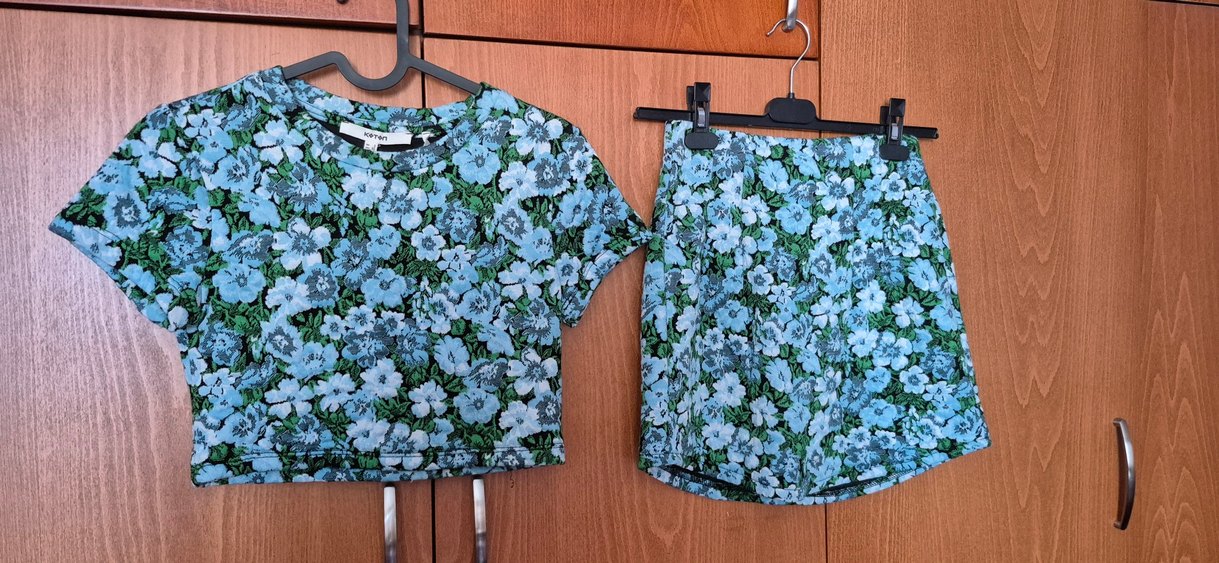 Yeşil Çiçekli Kısa Kollu Crop Bluz ve Mini Etek Takım