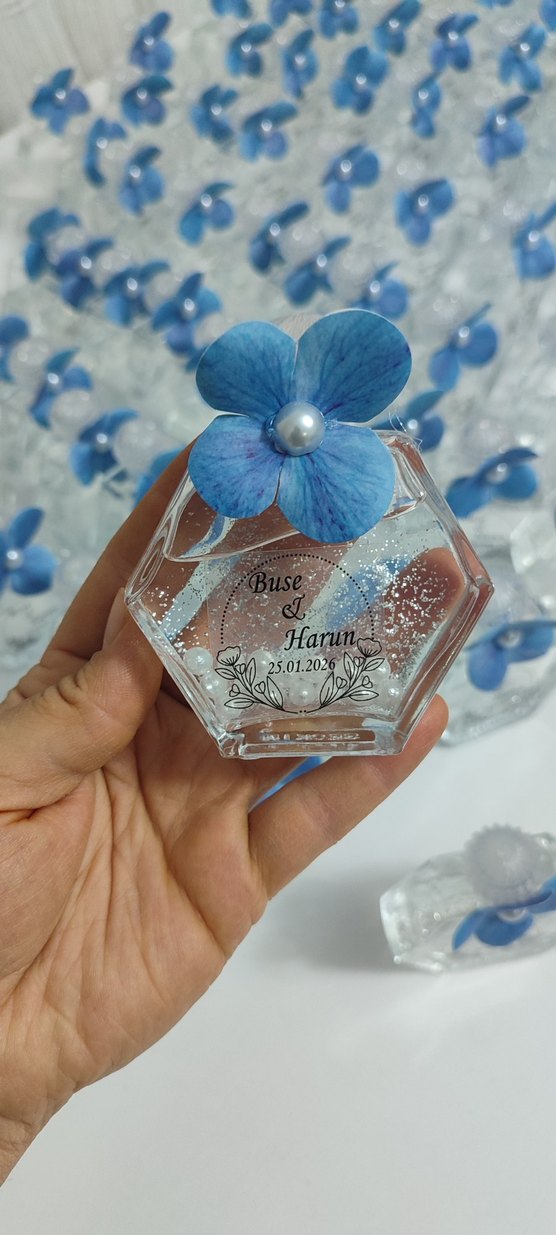 İsim ve tarih yazılı, inci detaylı mavi çiçek süslemeli kişiye özel renkli hediye şişesi.
