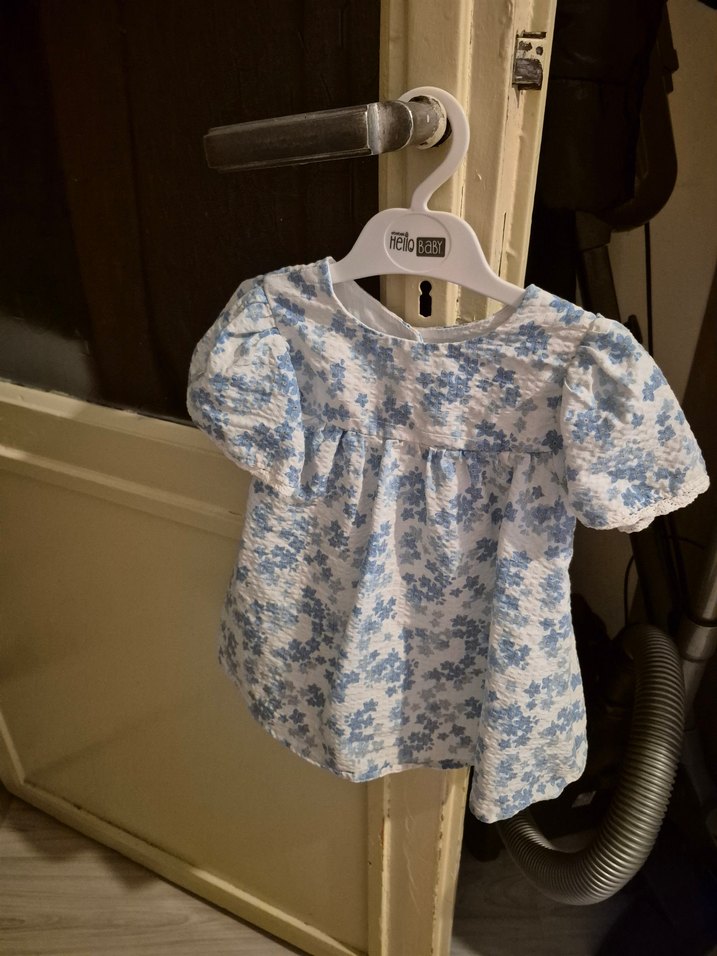 Kız çocuk elbisesi, kısa kollu ve bol kesimdir. Yumuşak kumaştan üretilmiş, pastel mavi tie-dye desenli ve fırfır detaylara sahiptir. SADECE 1 KERE GİYDİ...