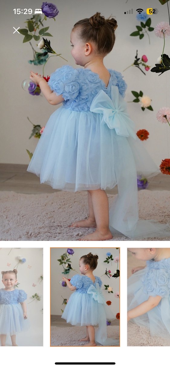 Fitted kesim, pastel mavi, kısa fırfırlı kollu, straplez çiçek desenli üstü ve arkada büyük fiyonk ile uzun kuyruk detaylı elbise.