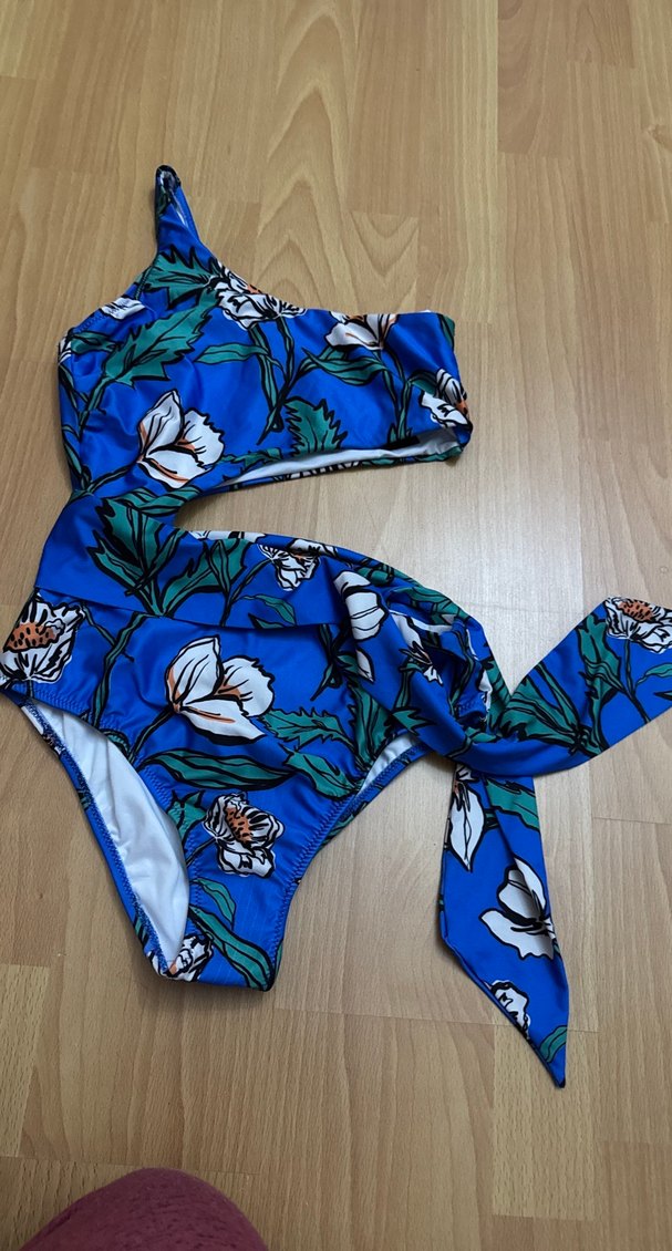 Mavi renkli, çiçek desenli, drapeli ve askılı, vücuda oturan kısa bikini. Açık hava aktiviteleri için uygun. İki tane bikini iki tane pareo çoklu ürün kısa süreliğine
