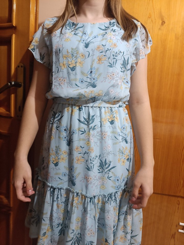 Mavi renkli, çiçek desenli midi elbise, bol kesim ve fırfır detaylara sahiptir. Kısa kollu ve straplez yakalı, yumuşak sentetik kumaştan üretilmiştir.