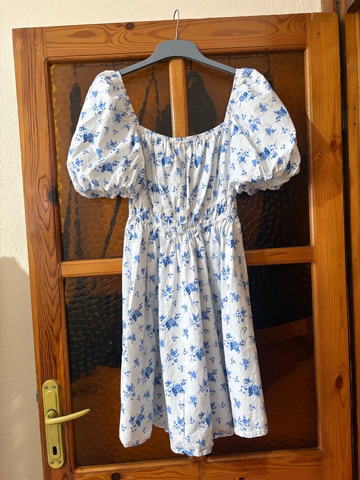 Mavi çiçek desenli, kısa balon kollu, dökümlü kesim pamuklu midi elbise, rahat ve günlük kullanım için uygundur.