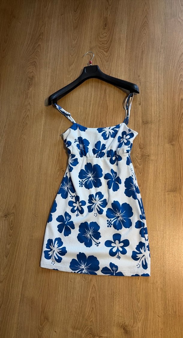 Mavi çiçek desenli, pileli detaylı, ince askılı ve straplez yaka mini bohem elbise, yumuşak sentetik kumaştan yapılmıştır. S beden