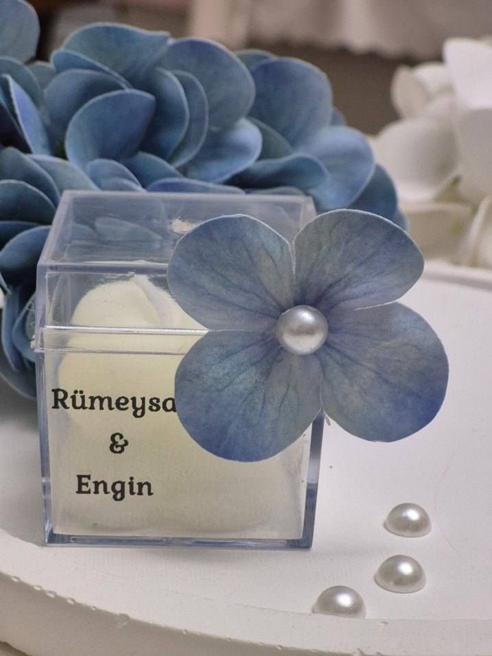 Mavi çiçek ve inci detaylı, buble mumlu Nişan hediyesi.
