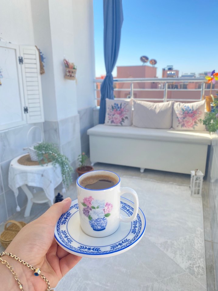 Çiçek desenli mavi pastel kahve fincanı ve tabağı, kahvenizi zarifçe yudumlamak için ideal. ☕