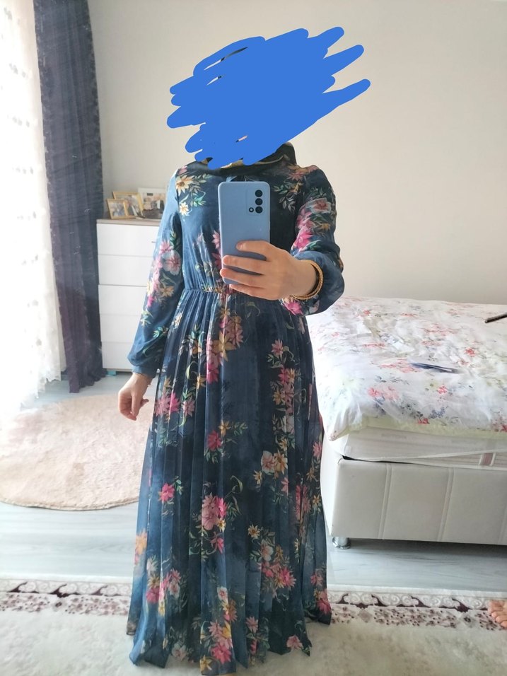 Mavi uzun elbise, yüksek yaka ve uzun kollu olup piliseli tasarıma sahiptir. Çiçek desenli, rahat kesim ve yumuşak sentetik kumaştan yapılmıştır.
