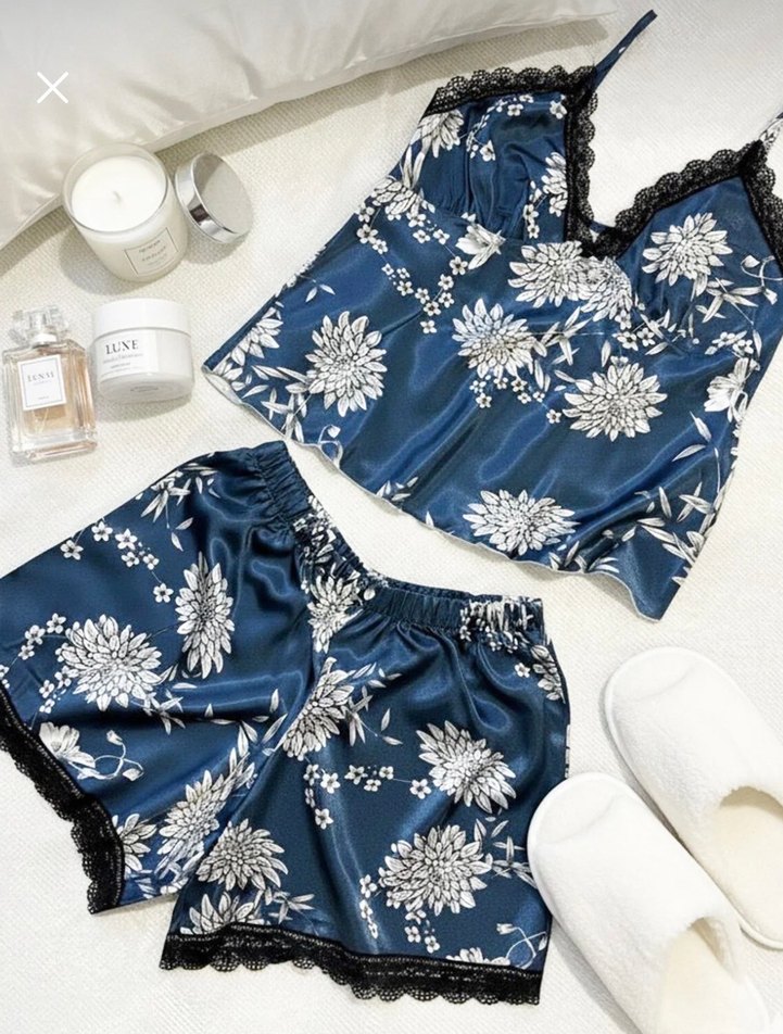 Mavi saten pijama takımı, bol kesim, ince askılı üst ve çiçek desenli, siyah dantel detaylı, rahat bohem tarzda.